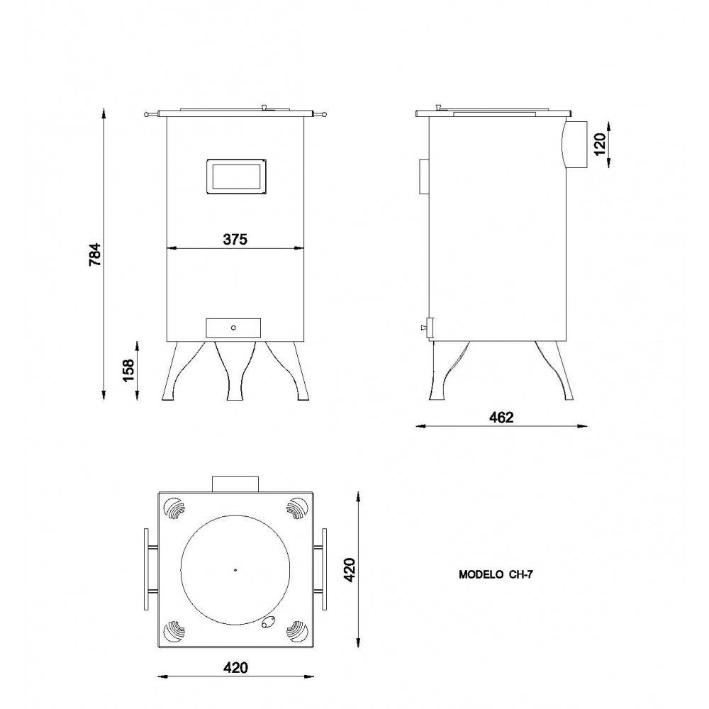 Estufa de leña redonda FM BH-7 con parrilla calientaplatos superior, cristal vitrocerámico y salida de humos trasera, ideal para calentar hasta 200 m³ con una potencia de 8 kW.